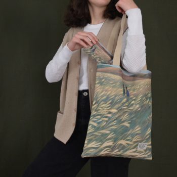 La ilustración del Totebag Girasoles se realizó dibujando directamente sobre la tablet. Esta ilustración pertenece a la serie Haiku 2022 y al que acompaña el texto: «Noche estrecha / apenas mece / los nidos del sol«.